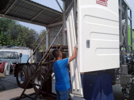 本公司依据顾客提供的气瓶支架设计气瓶罩尺寸,保证高度及宽度不超出驾驶室;气瓶罩左右两侧设计开门,不带小门,同时设计配套铰链、限位以及门锁;通风设计为百叶窗样式,保证有良好的通风效果;造型设计时尚、大气、简约与驾驶室造型相吻合,气瓶罩外表面带有重汽logo。设计完全满足顾客的要求。