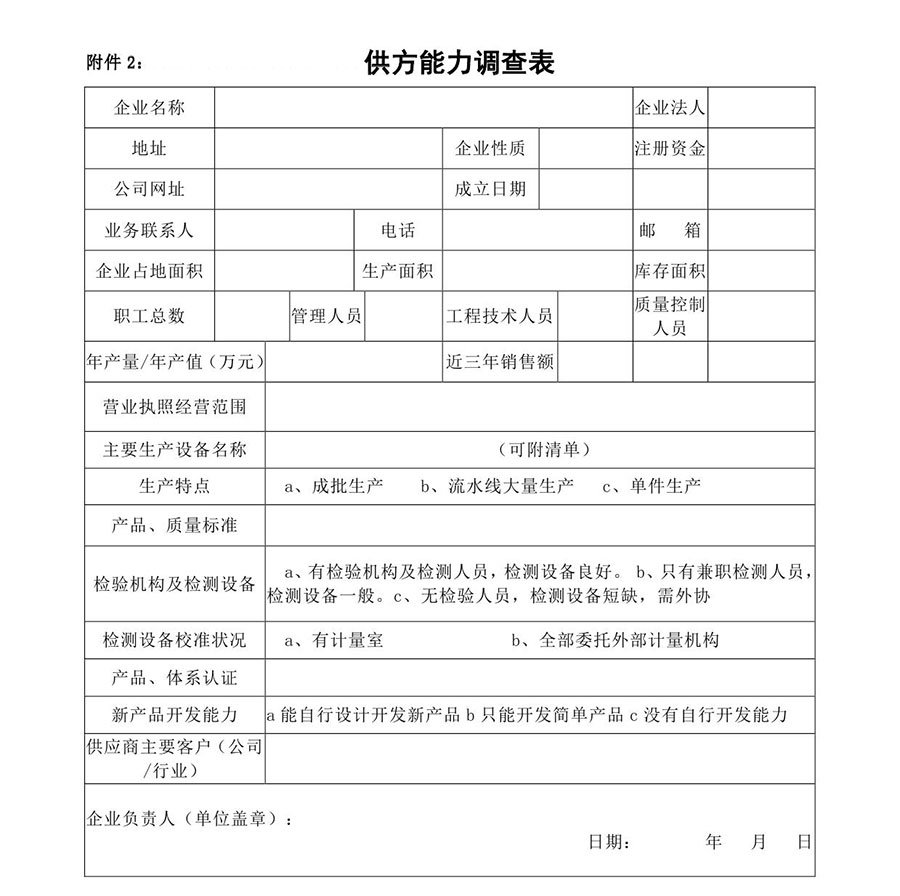 c有相关物资的生产能力,并具备一定的生产规模,如:场地、人员、生产设备、检测设备等,且如实填写《供方能力调查表》