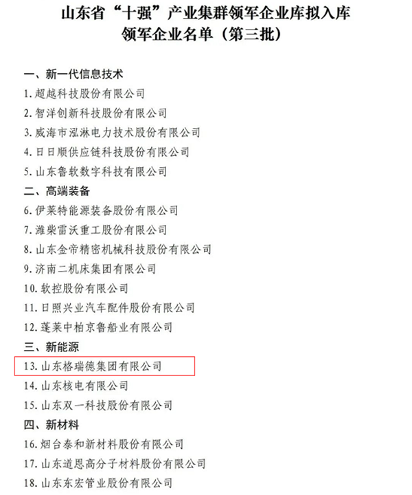 按照全省新旧动能转换“五年取得突破”工作方案和《“十强”产业“雁阵形”集群培育支持办法》《“十强”产业集群领军企业培育支持办法》有关要求,近期,省发展改革委会同有关部门公布了2021年度入库培育的“十强”产业“雁阵形”集群和集群领军企业名单(第三批),山东格瑞德集团有限公司(新能源)入选山东省“十强”产业集群领军企业库。