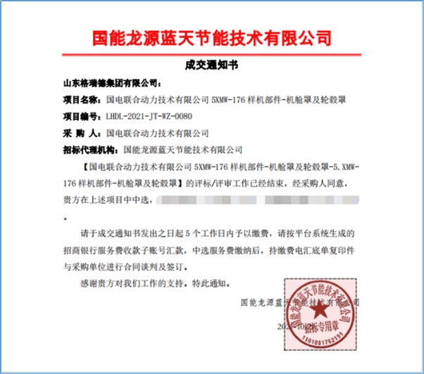 近日,格瑞德集团成功中标国电联合动力技术有限公司 5XMW-176 样机部件-机舱罩及轮毂罩项目,项目内容包括:5XMW-176 样机部件-机舱罩及轮毂罩1台(套),2021SJ0045-000077-A  UP5200-B01风力发电机组轮毂罩机舱罩及其附件招标技术规范。
