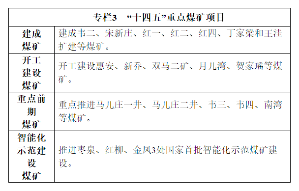 3.推进煤炭绿色智能开采。因地制宜推广充填开采、保水开采、煤与共伴生资源共采等绿色低碳开采技术,加强煤炭洗选加工,提高原煤入选(洗)比重。提高矿井水、煤矸石、煤泥、煤矿瓦斯等资源综合利用水平,大力发展矿区循环经济。因地制宜通过发展风电、光伏、现代农业、林业等产业,推进矿区生态修复。加快煤矿智能化发展,推进采掘、供电、供排水、通风、运输、安全监测、洗选等环节智能化改造提升,推行新建煤矿智能化设计,高标准建成枣泉、红柳、金凤等国家首批智能化示范煤矿。到2025年,原煤入选率达到90%以上,120万吨/年以上大型煤矿和灾害严重煤矿基本实现智能化。