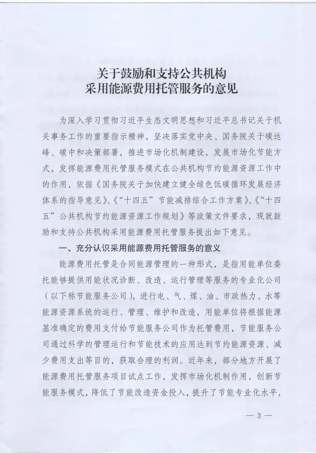 为深入贯彻习近平生态文明思想和习近平总书记关于机关事务工作的重要指示精神,落实党中央、国务院关于碳达峰、碳中和决策部署,近日,国管局、国家发展改革委、财政部印发了《关于鼓励和支持公共机构采用能源费用托管服务的意见》(以下简称《意见》),规范和加强公共机构采用能源费用托管服务工作。