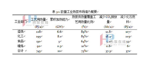 目前,我国工业热泵使用量还较少,欧盟对于工业热泵市场潜力的估计可提供一定程度的参考。食品、造纸、化工以及石油精炼被欧盟认为是最适合集成热泵的工业部门。Marina, A估算了欧盟工业热泵的市场潜力,结果如表3-1所示。在该情境下,这四个部门一年的工艺用热量达到了745×106GJ/a,对于150℃热泵市场而言,这四个部门累积加热能力可以达到20GW,使用热泵回收温度适宜的余热可覆盖73%的生产工艺用热所需,并最终可减少37.3Mt/a的二氧化碳排放以及371×106GJ/a的化石燃料的燃烧。虽然我国工业结构以及工艺水平与欧盟存在着一定的差异,但从这情景来看,工业热泵投入使用是建设社会主义现代化强国中由高速度发展转向高质量发展、实现碳达峰碳中和的必然要求。