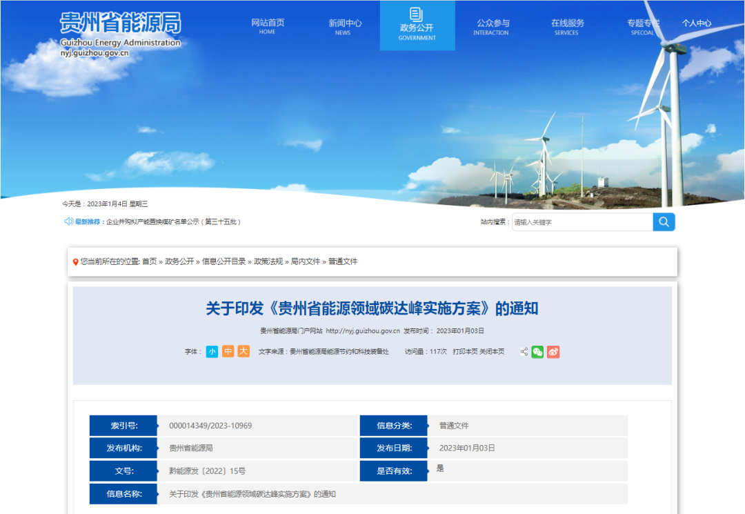 贵州省能源局关于印发《贵州省能源领域碳达峰实施方案》的通知。