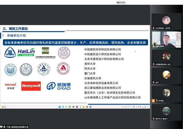11月9日,由全国暖通空调及净化设备标准化技术委员会(以下简称全国暖通标委会)联合中国建筑科学研究院有限公司组织召开《室内温度控制器通用技术条件》国家标准编制组成立暨第一次工作会议,会议采用线上方式进行。格瑞德集团作为参编组成员出席本次会议。
