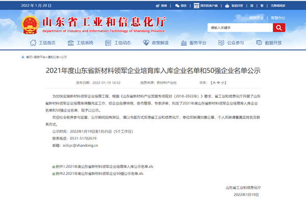 1月19日,山东省工信厅发布《2021年度山东省新材料领军企业入库名单及50强名单公示》,集团成功入选2021年度山东省新材料领军企业50强,此次是继2019年度入围后的再次入围。