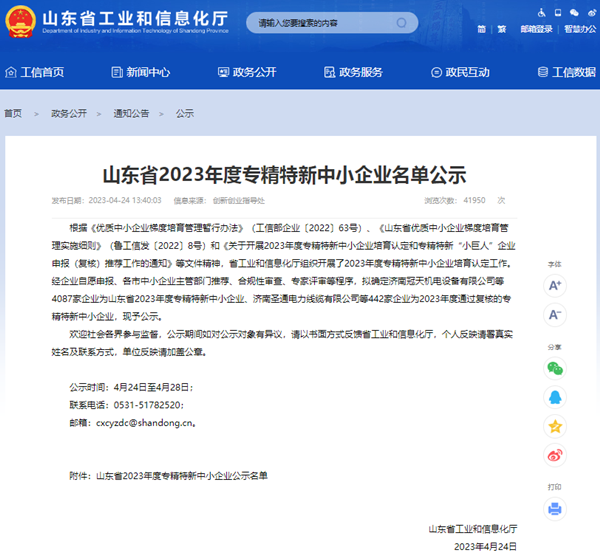 近日,山东省工业和信息化厅下发通知,对山东省2023年度专精特新中小企业名单进行公示。记者获悉,4087家企业入选山东省2023年度专精特新中小企业,442家企业入选2023年度通过复核的专精特新中小企业。2023年4月24日,山东格瑞德环保科技有限公司上榜山东省2023年度专精特新中小企业公示名单。