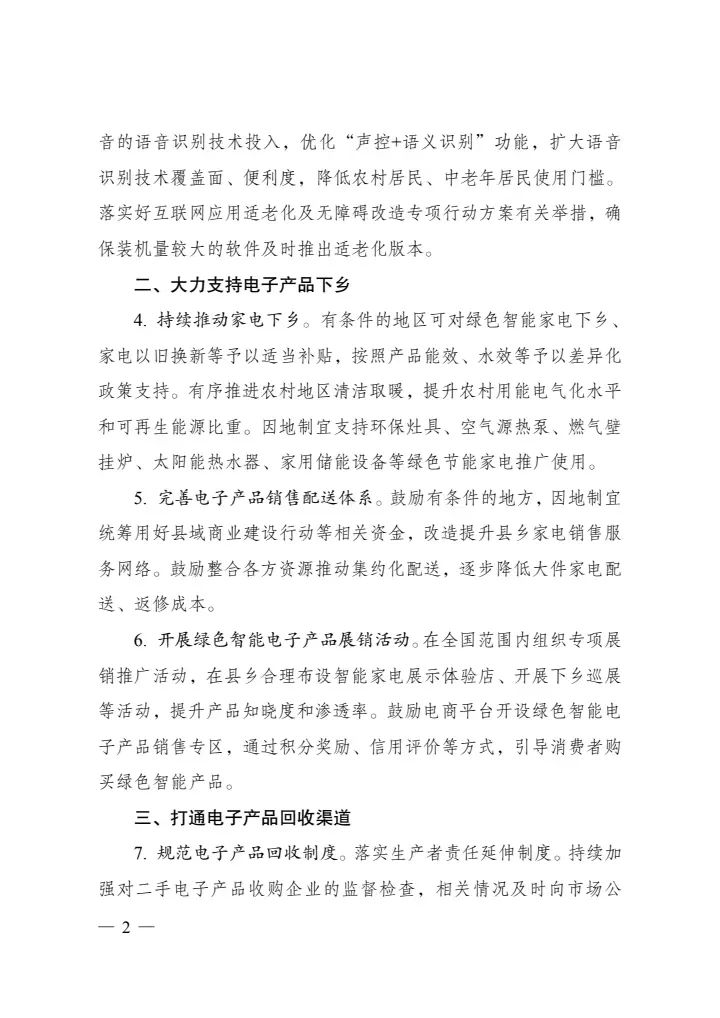 7月21日,国家发改委等部门印发《关于促进电子产品消费的若干措施》,措施中提到,为有效促进电子产品消费,助力消费恢复和扩大。持续推动家电下乡。有条件的地区可对绿色智能家电下乡、家电以旧换新等予以适当补贴,按照产品能效、水效等予以差异化政策支持。有序推进农村地区清洁取暖,提升农村用能电气化水平和可再生能源比重。因地制宜支持环保灶具、空气源热泵、燃气壁挂炉、太阳能热水器、家用储能设备等绿色节能家电推广使用。