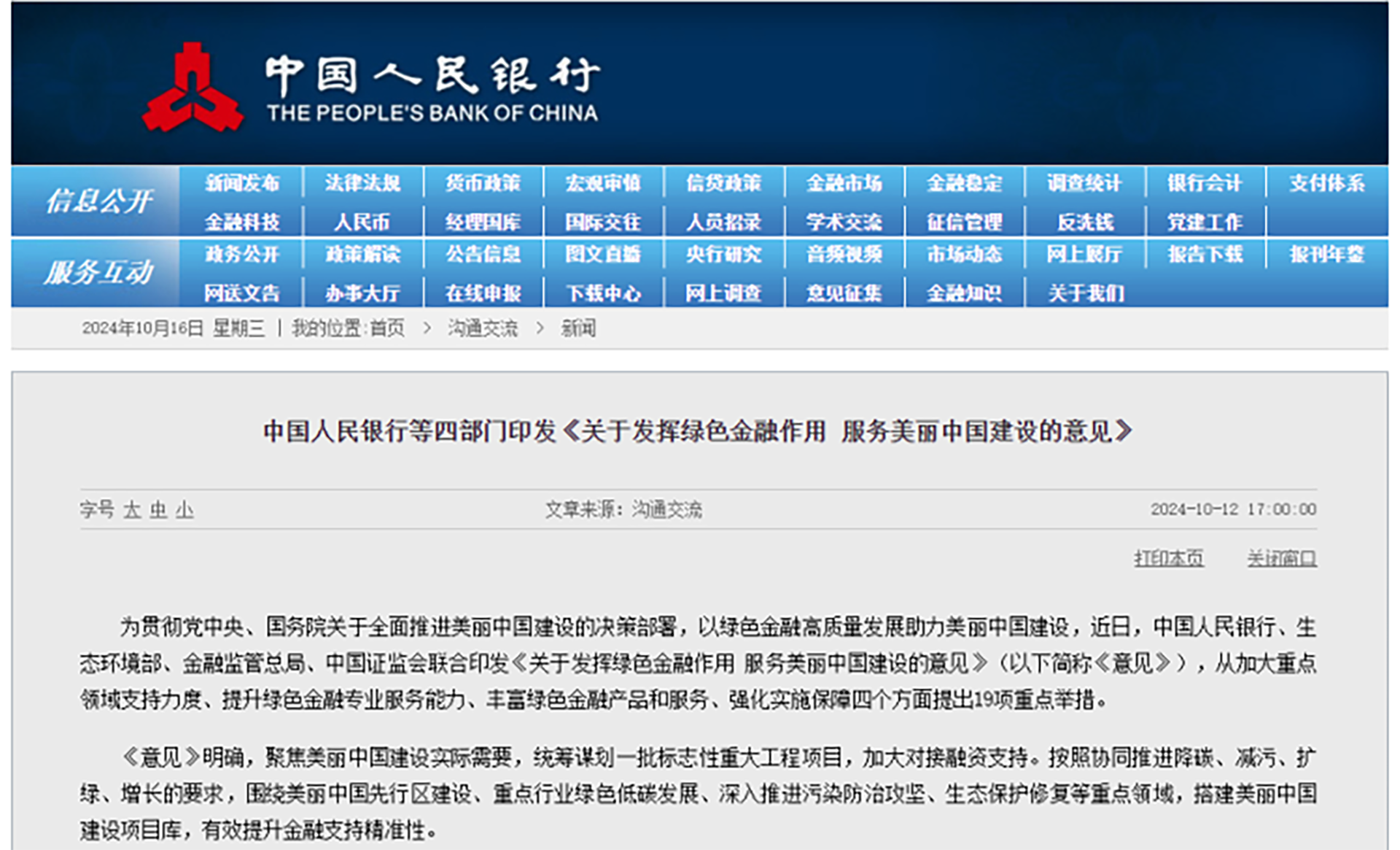 近日,中国人民银行等四部门印发《关于发挥绿色金融作用 服务美丽中国建设的意见》。