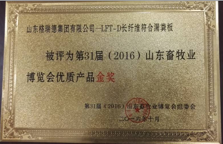 此次博览会上,我公司展出了新型复合材料制品—畜牧业养殖用LFT-D长纤维复合材料漏粪板,该产品作为漏粪板的更新换代产品在展会上格外抢眼,并荣膺此次博览会组委会评选之最高奖—金奖,成为我公司的一大荣耀。