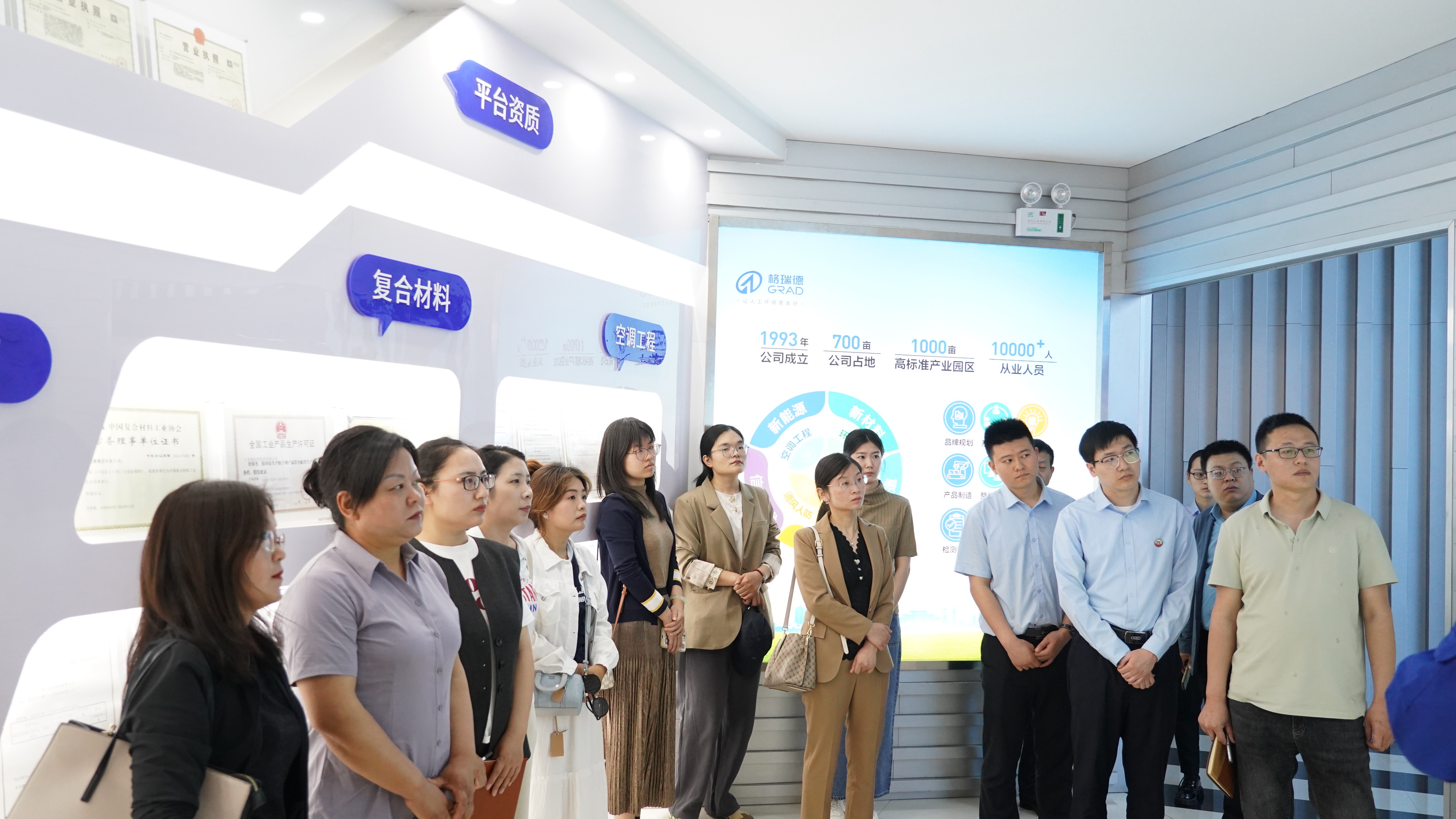 科技工作者一行首先来到格瑞德集团展厅,格瑞德人工环境产业设计研究院副院长焦其朋向大家讲解集团发展历程、核心业务、创新实力、获得荣誉等。通过参观考察,观摩团一行纷纷对集团的全产业链发展表示高度赞赏。