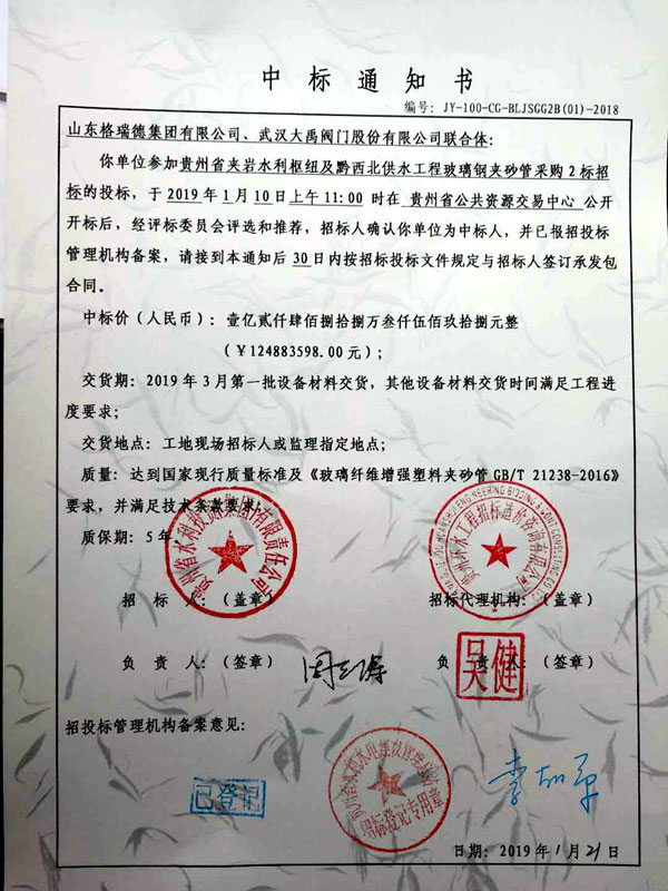 格瑞德集团缠绕公司迎来一九年开门红,在参加“贵州省夹岩水利枢纽及黔西北供水工程玻璃钢夹砂管采购2标”的投标项目中,中标金额高达1.248亿元。在春节临近期间,集团缠绕公司为格瑞德献上春节贺礼,喜贺集团成功开拓大西南。